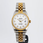 Step into a world of unparalleled elegance with the 1999 Rolex Datejust Two-Tone Gold, model 16233, a 36mm marvel that seamlessly blends the resilience of stainless steel with the allure of 18k yellow gold. This timepiece is a testament to the art of watchmaking, featuring a radiant white dial that serves as a backdrop for the exquisite Roman numeral hour markers and the iconic date display, magnified by Rolex's signature Cyclops lens for supreme clarity.