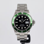 The Submariner Date 16610LV is more than just a striking accessory; it's a testament to Rolex's engineering excellence, featuring a dependable automatic movement and a convenient date display at 3 o'clock, enhanced for visibility with a Cyclops lens. Built to conquer depths of up to 300 meters, it’s your ultimate ally for underwater exploration and urban escapades. With the "Kermit," you don’t just wear a watch—you adorn your wrist with a piece of Rolex heritage, a symbol of enduring style and relentless performance. Elevate your collection and make every second count with this legendary diver’s watch.