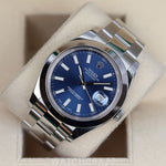 Crafted from Rolex's signature Oystersteel, the Datejust is as durable as it is beautiful, ensuring resilience against the elements while maintaining its sleek, polished appearance. The eye-catching blue dial is adorned with simple yet striking stick markers and a date window at the 3 o'clock position, magnified by Rolex’s distinctive Cyclops lens for easy reading.