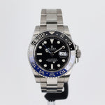Crafted with a robust 40mm stainless steel case, the GMT-Master II "Batman" is built to withstand the rigors of global exploration while exuding timeless elegance. The sleek black dial, with its luminescent hour markers, ensures visibility in any light, while the dual time zone display keeps you perfectly in sync, wherever you roam.
