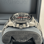 The Carrera Calibre Heuer 01 has a strong 45mm stainless steel case. A black ceramic bezel with a tachymeter scale adds sportiness and functionality to its bold and modern design. The folding clasp stainless steel bracelet is comfortable and secure for daily wear.