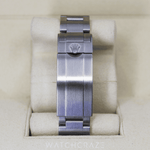 The Rolex Oystersteel case and black dial are protected by a sapphire crystal. The black dial has luminescent hour markers and Mercedes hands.