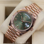 Step into a world where time becomes an art form with the 2023 Rolex Day-Date Rose Gold Green Dial 40mm (Reference 228235). Crafted for those who dare to stand out, this timepiece isn't just a watch—it's a testament to your individuality and impeccable taste.