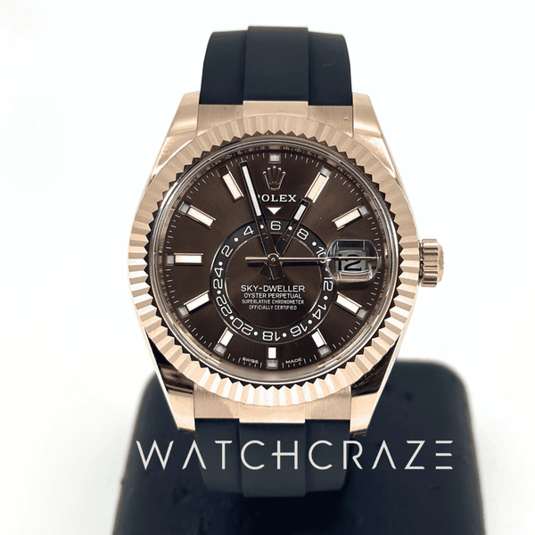 The 42mm Rolex Sky-Dweller Oysterflex Rose Gold Chocolate Dial 326235 from 2023 exemplifies the brand's signature style and cutting-edge craftsmanship.